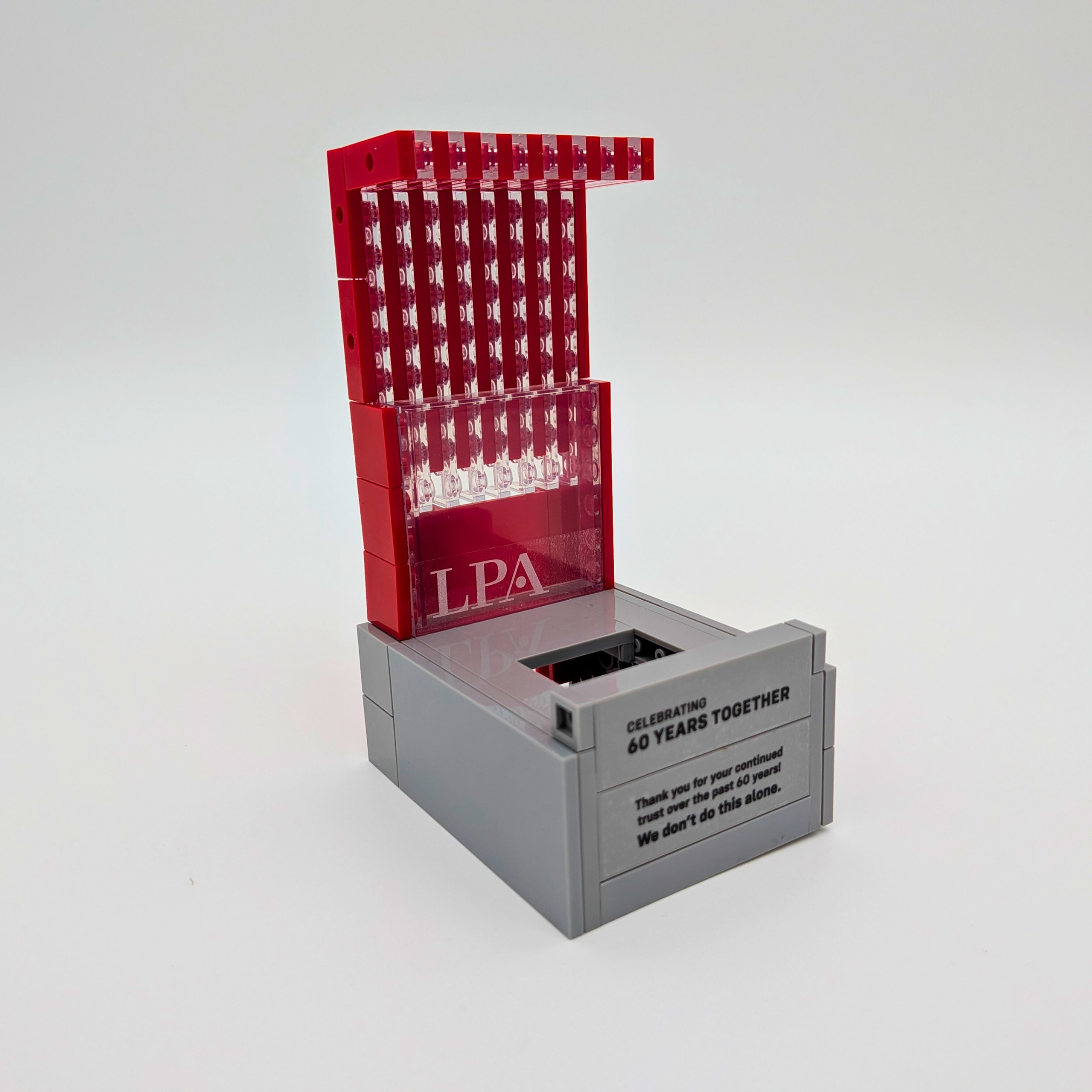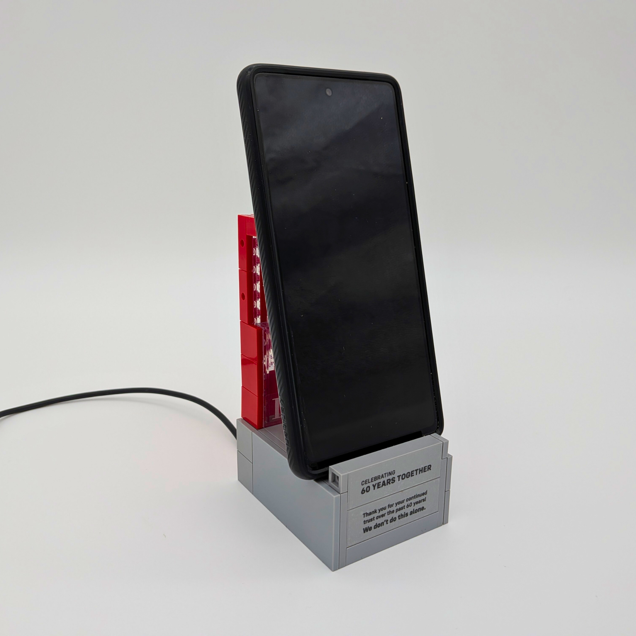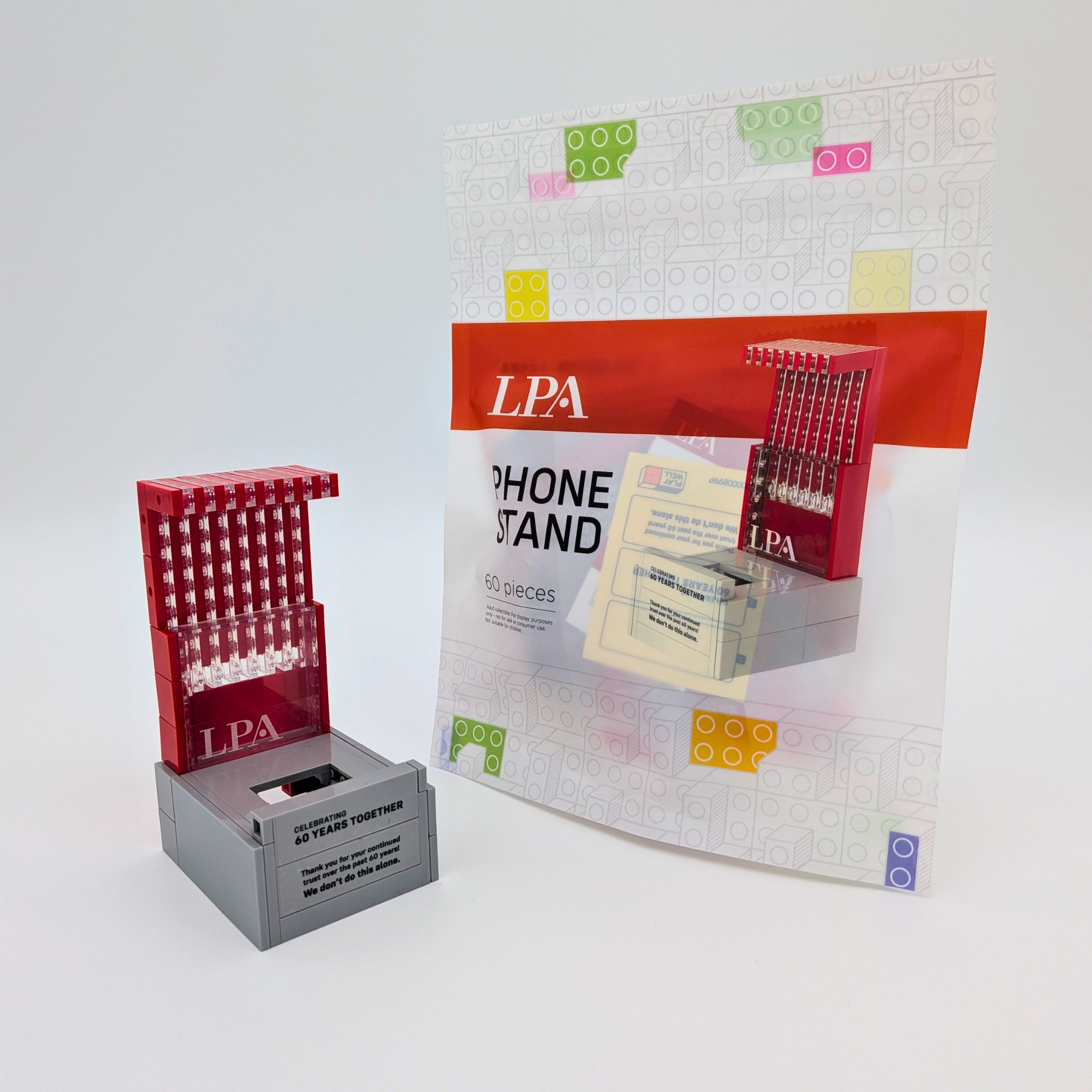 In August of 2025, LPA approached Playwell Bricks with their second project in the calendar year. The request for a functional phone stand that would also allowed the displayed phone to charge. The catch: the project budget only allotted a 60 pieces model.