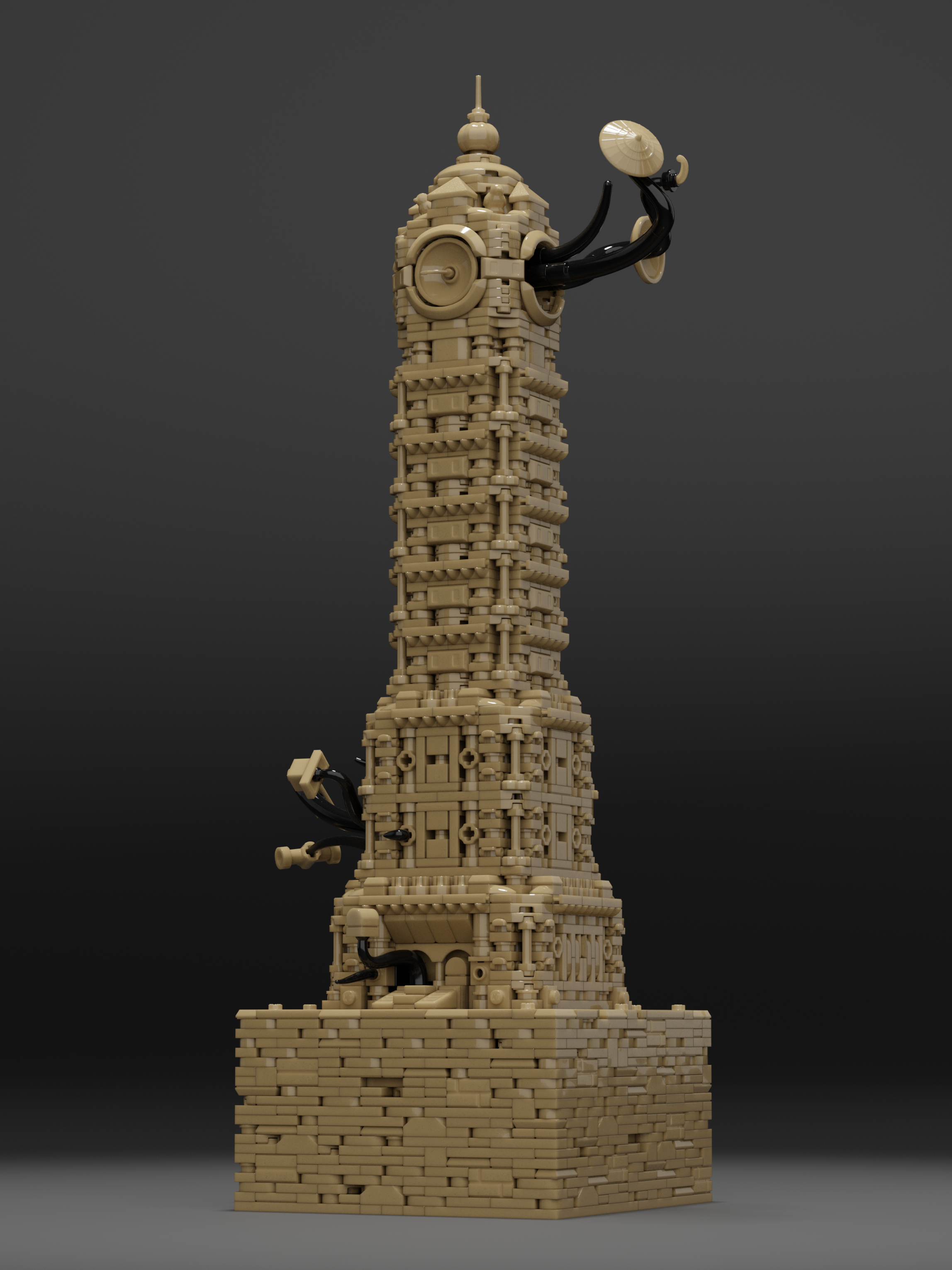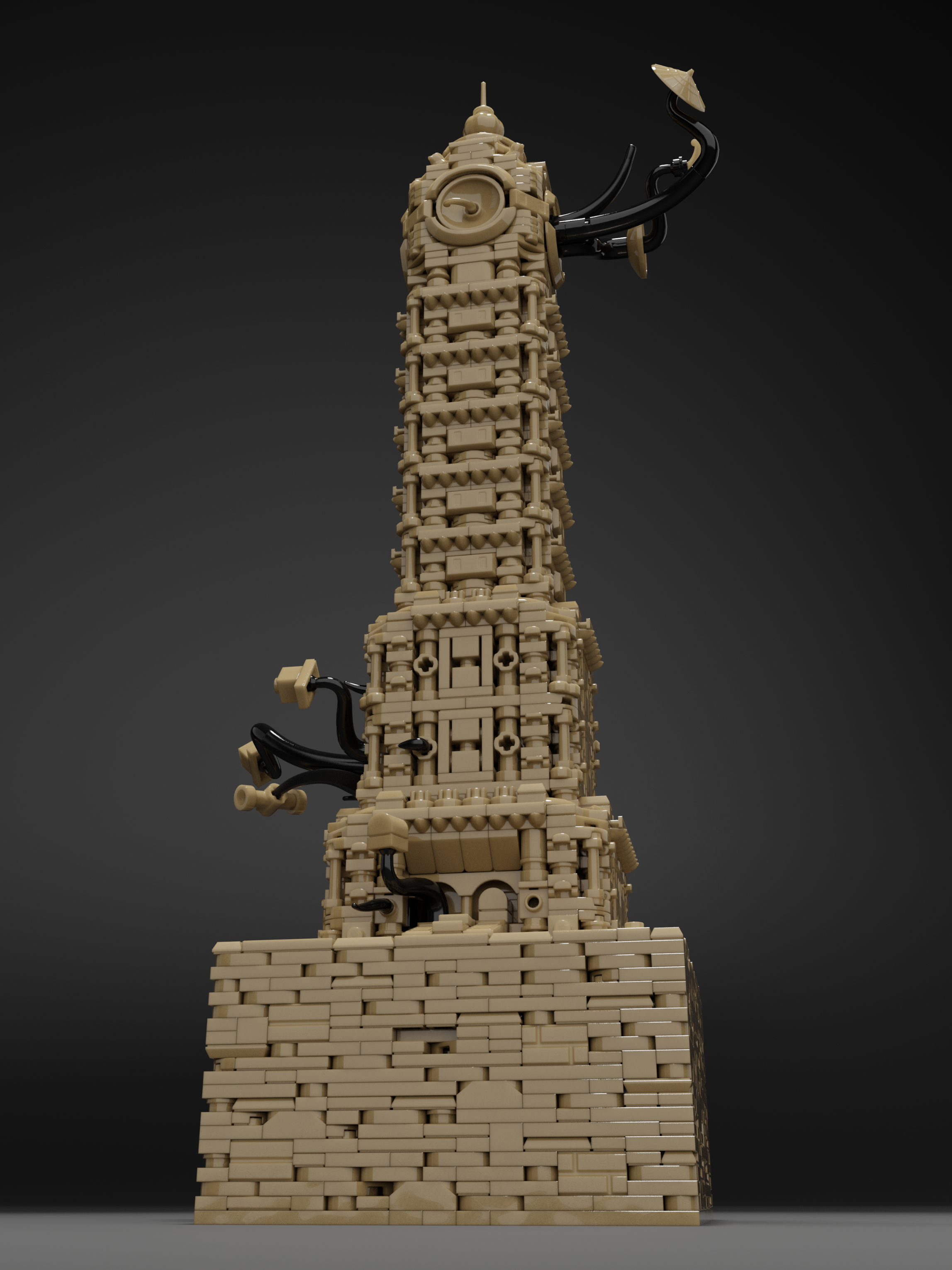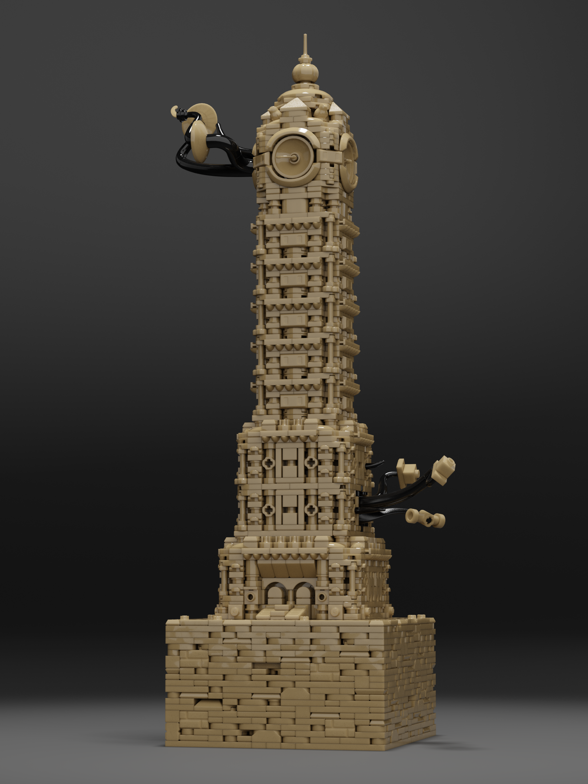 Clocktower Unfinished is the second entry in the Framework limited collection. The tower draws inspiration from any clocktowers around the world, including Big Ben, Ghanta Ghar and the Joseph Chamberlain Memorial Clock Tower. The final creation blends architectural influence, echoing Spanish Baroque. Dark Tan was chosen as the unique color for the piece, which presented immediate challenges. Very limited options for brackets, SNOT (Stud Not On Top) bricks and arches resulted in Jared’s use of vehicle mudguards, sword hilts, roller-skates, and other odd parts to capture the final details exterior details.