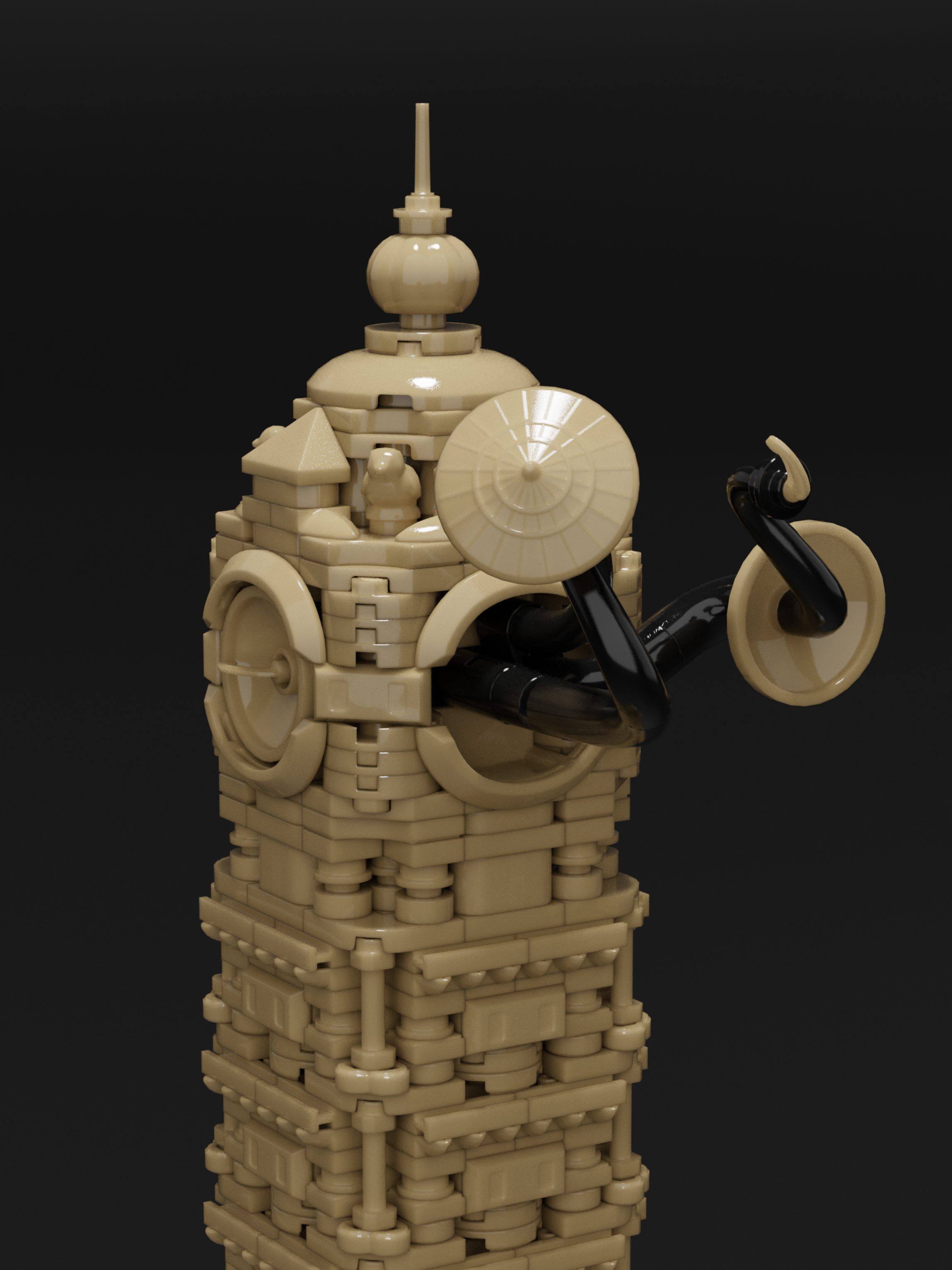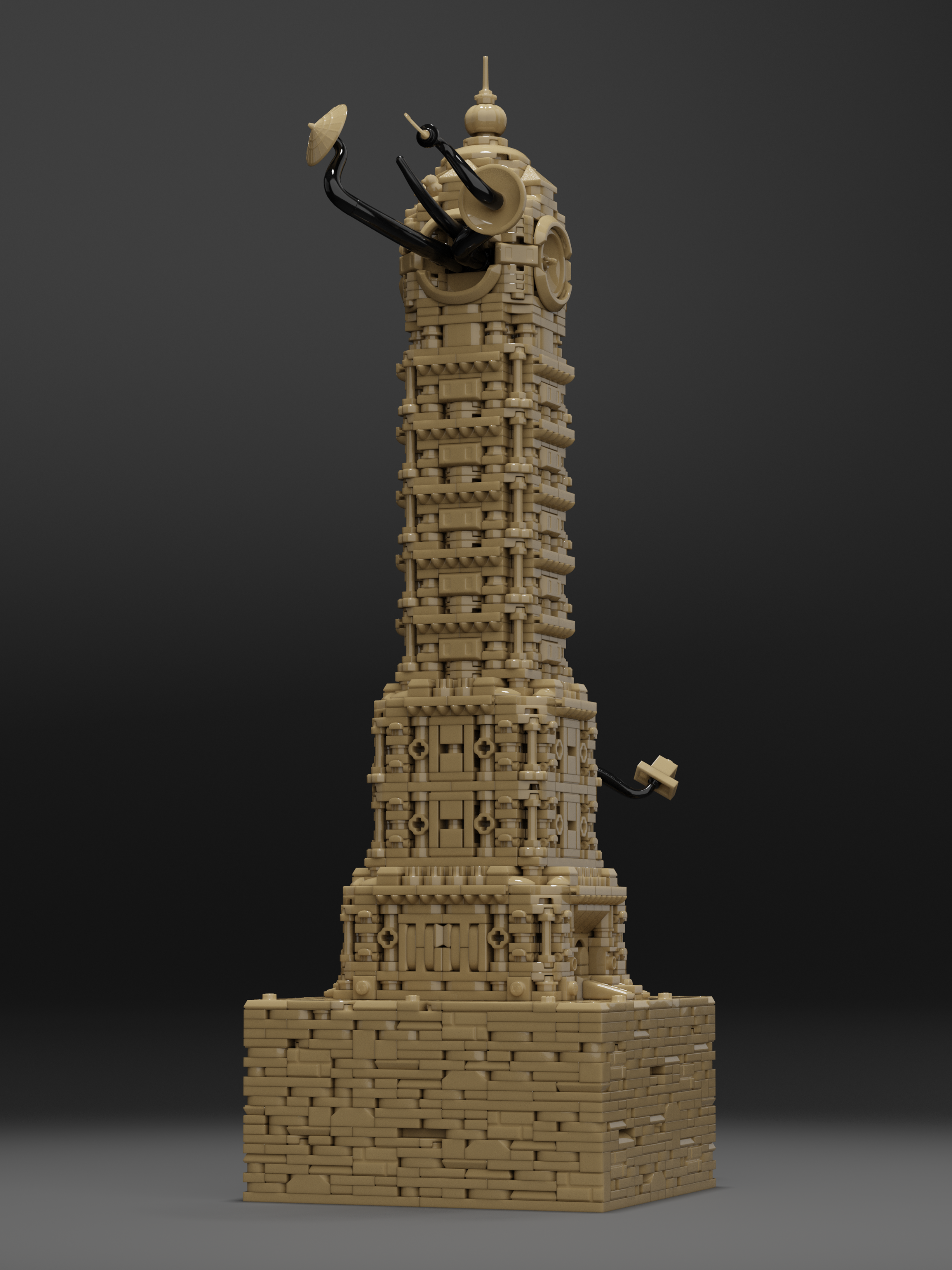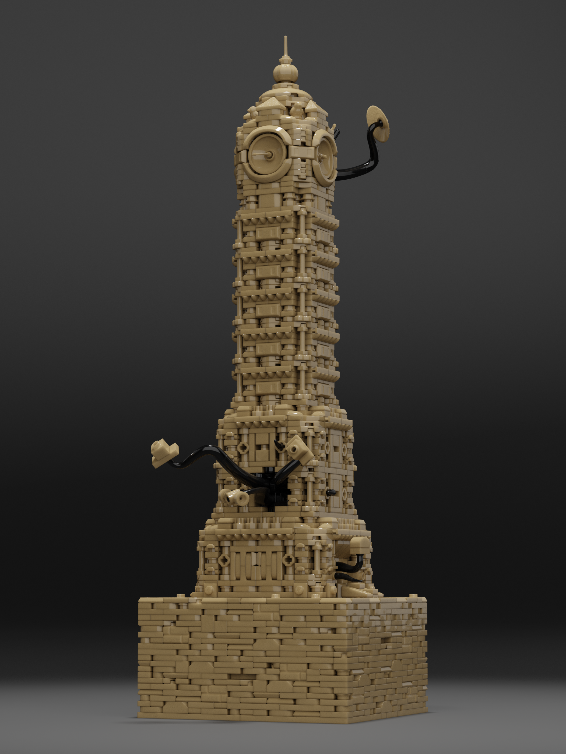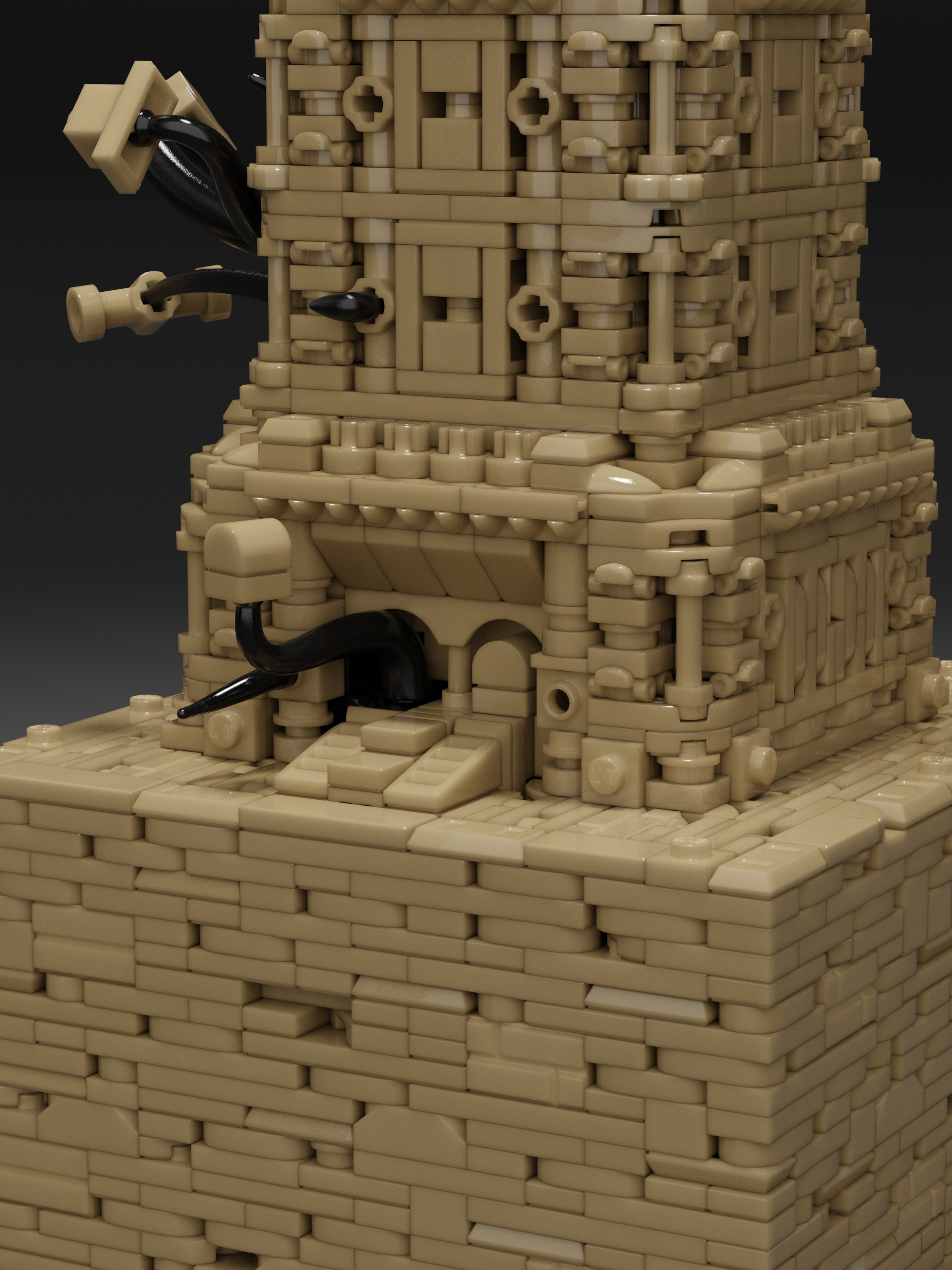 Clocktower Unfinished is the second entry in the Framework limited collection. The tower draws inspiration from any clocktowers around the world, including Big Ben, Ghanta Ghar and the Joseph Chamberlain Memorial Clock Tower. The final creation blends architectural influence, echoing Spanish Baroque. Dark Tan was chosen as the unique color for the piece, which presented immediate challenges. Very limited options for brackets, SNOT (Stud Not On Top) bricks and arches resulted in Jared’s use of vehicle mudguards, sword hilts, roller-skates, and other odd parts to capture the final details exterior details.