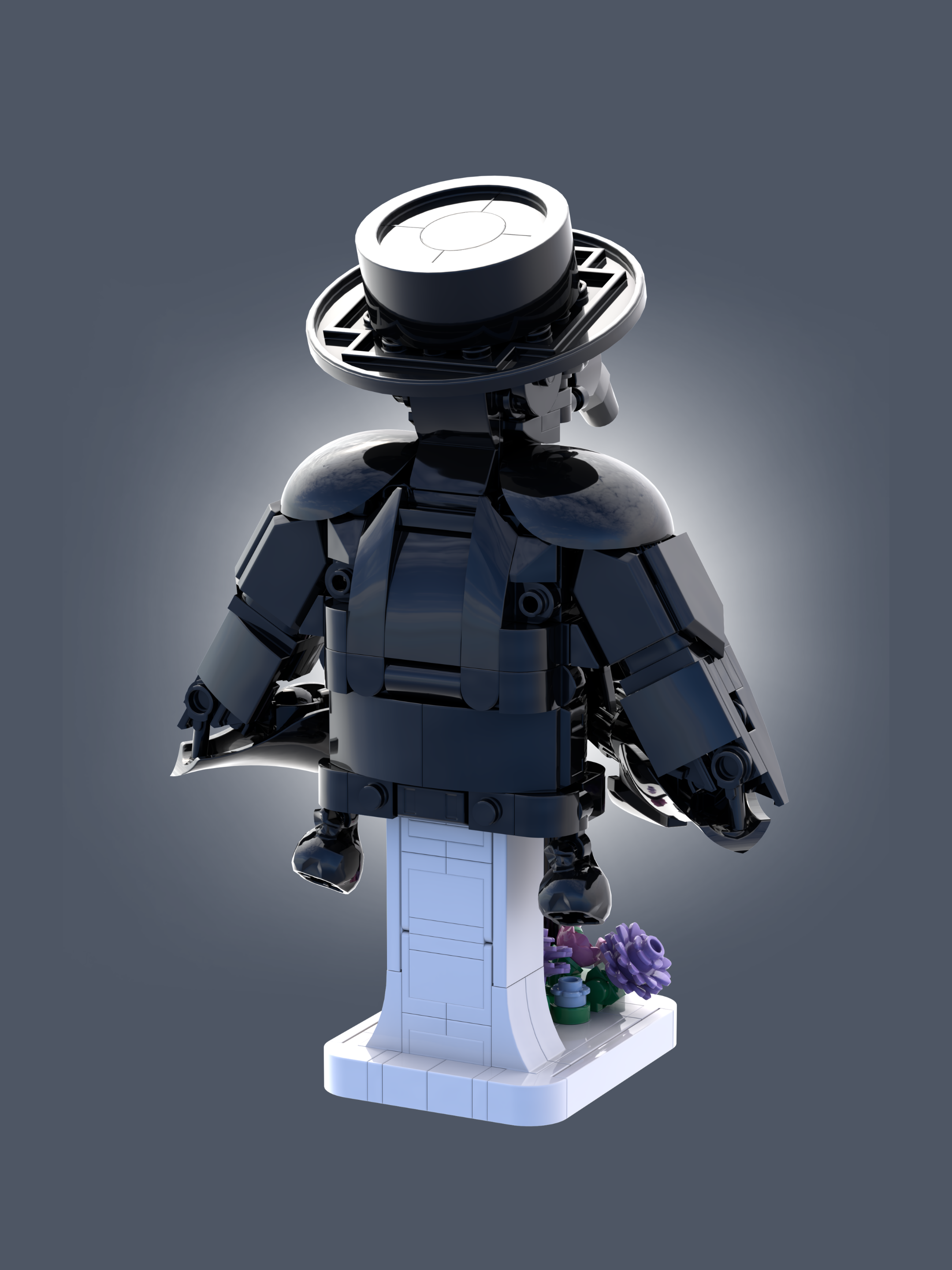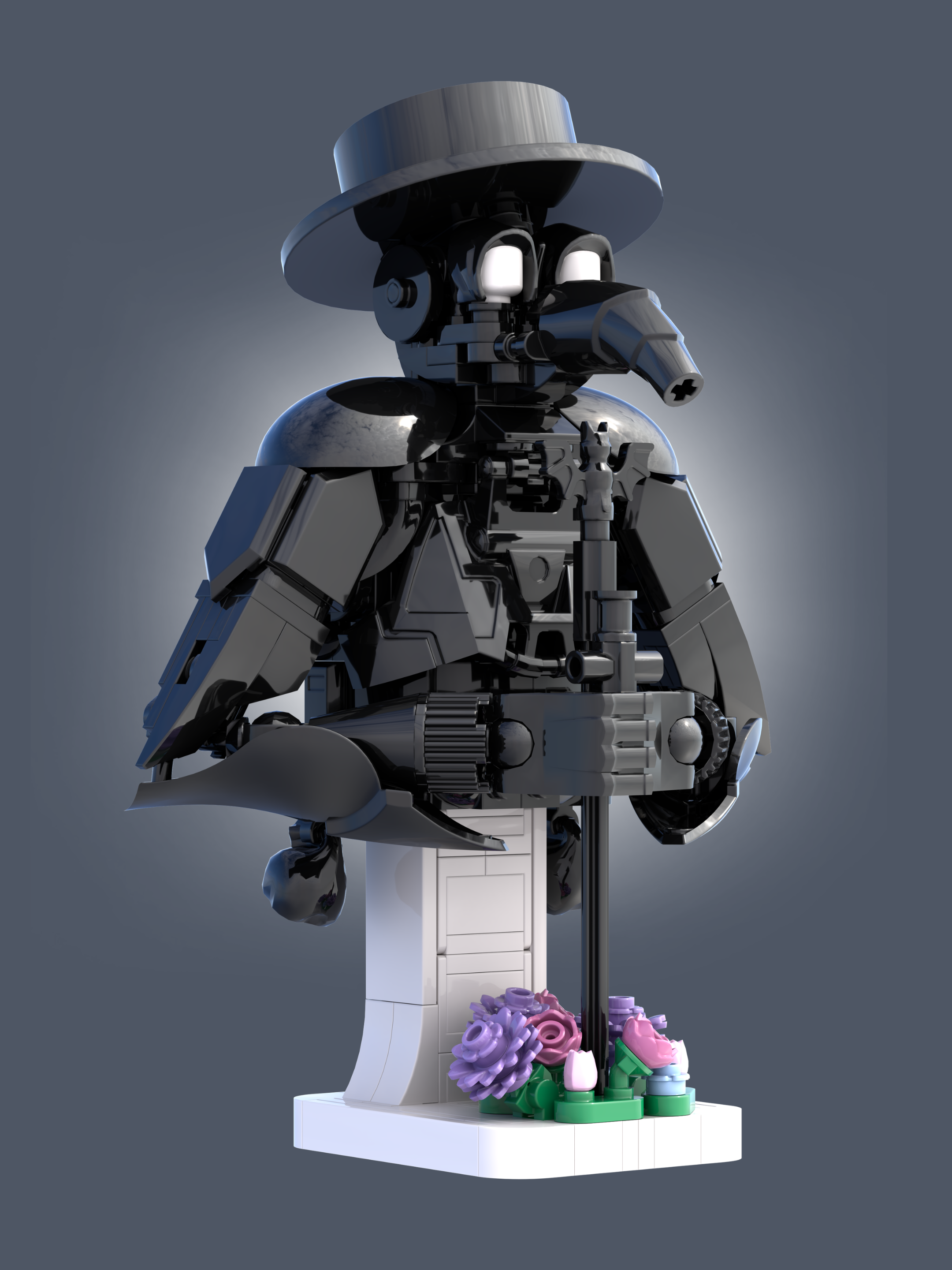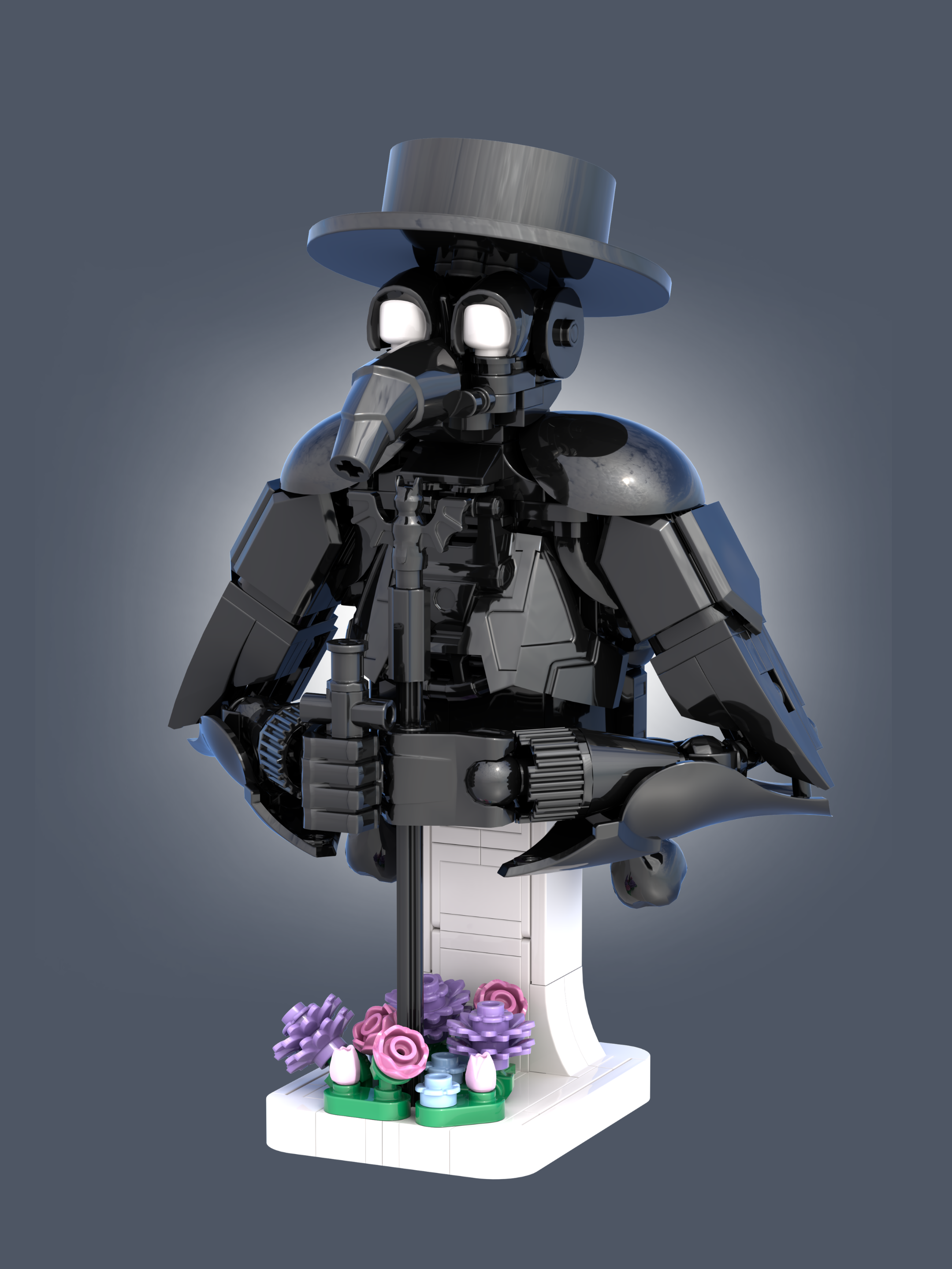 The plague doctor began to form from the use of Minifigure® heads and hoods to create the eyes of the iconic mask. From there, Jared explored using large, specialized armor plates and filling the gaps with small horns, teeth and other greebles. The flowers blooming around the base of the plague doctor’s staff imply a small peace in the horror.