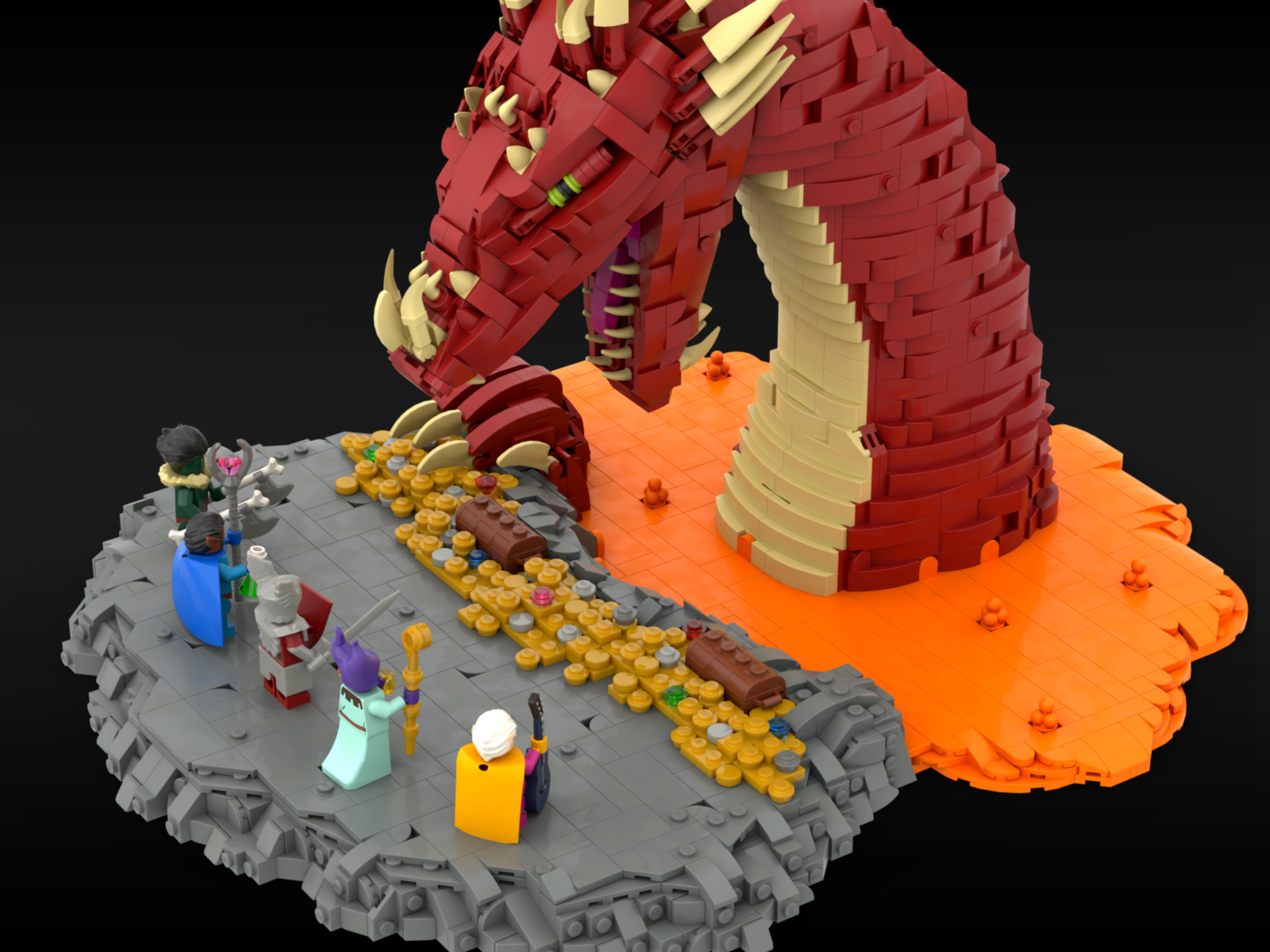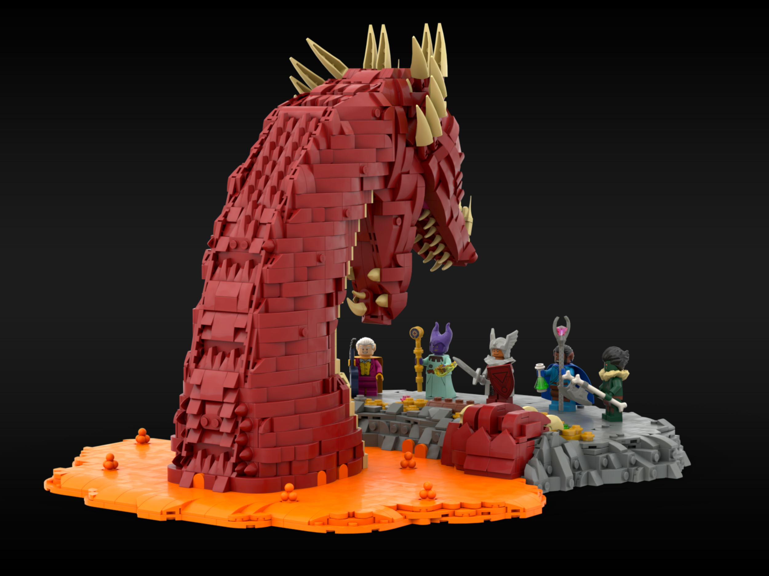 “Into the Dragon’s Lair” was Jared Oswald’s entry into the LEGO® Ideas “50 Years of Dungeon and Dragons” challenge. The design was not chosen to advance to the review stage, but remains one of Jared’s most popular builds on social media and one of our favorites. The bust features an Ancient Red Dragon emerging from lava to guard its horde against a group of adventurers. This project was designed digitally, but never physically built due to the time constraint of the challenge. The minifigures for the model were designed using digital recolors of existing LEGO® parts.