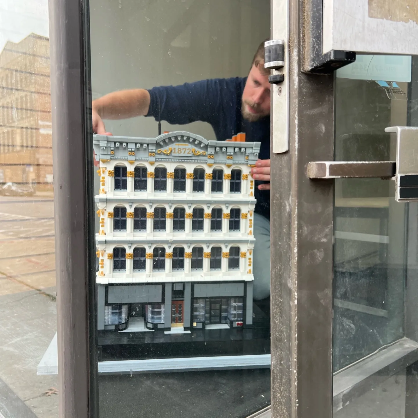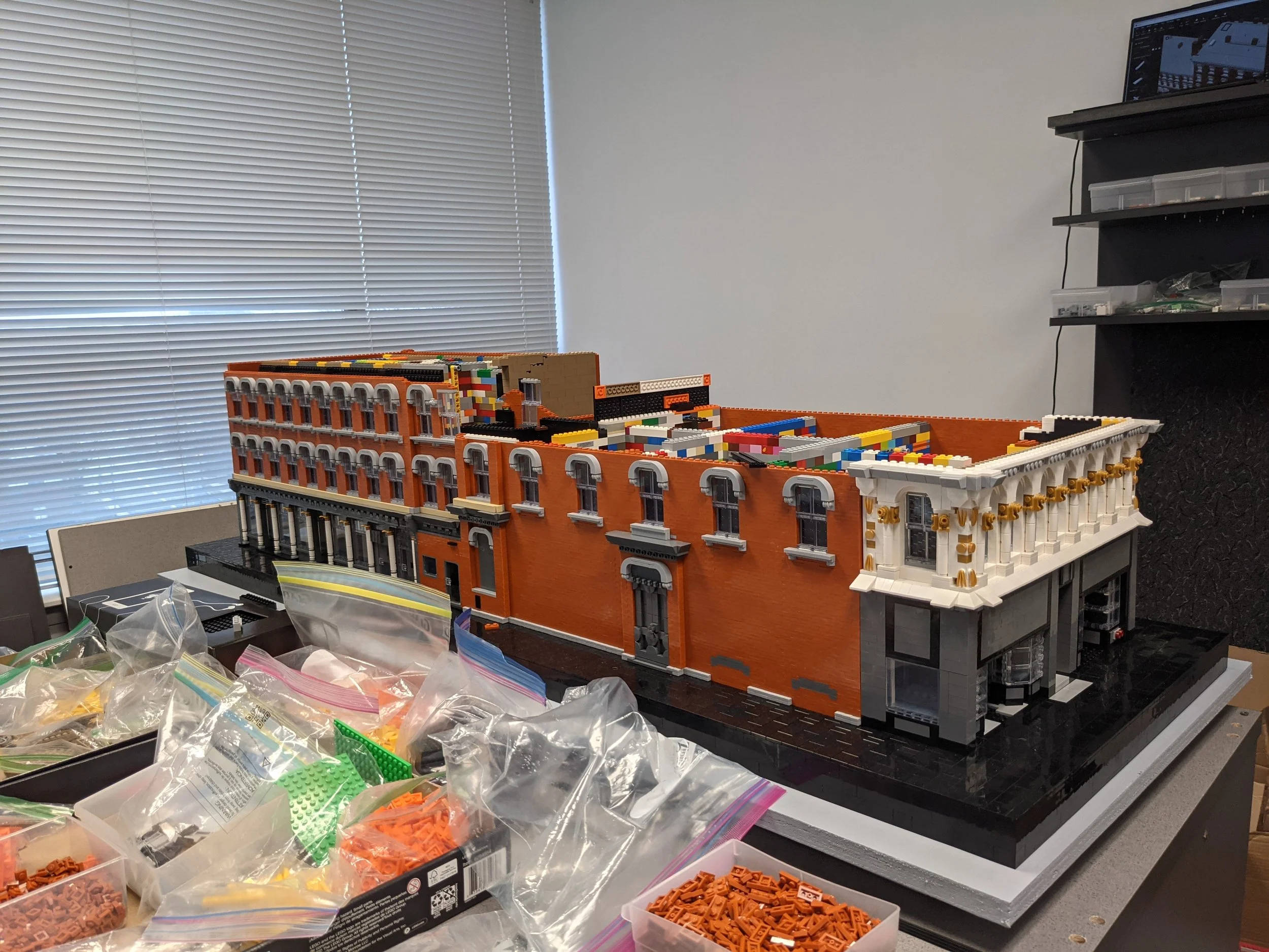 The Cast Iron Building is a 1:40 scale model built as a tribute to its likeness. It was designed and built to commemorate the building’s 150th anniversary, as it joins the exclusive club of historic Poughkeepsie buildings. After six months of design and build time, and overcoming several design challenges, Jared was proud to present the model to the building’s owner, Tom Cervone. The final model uses 38,672 pieces and including its wooden base platform, weighs 109 lbs. Almost fifty percent of the model’s final part count comes from the 1x2 dark orange plates that make up the building’s brick exterior: an ambitious choice made to best emulate the red brick architecture the Cast Iron Building is known for. The interior of the model hosts large, black plate facades that are set back from the windows to add extra depth. The Cast Iron Building model was installed in the front window of the real Cast Iron Building in October of 2022 and remains there to this day, catching the eyes of those that pass by the building daily.